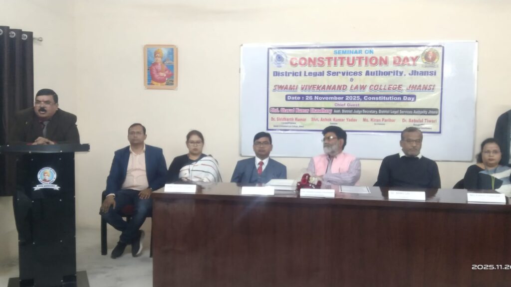 झाँसी : स्वामी विवेकानंद डिग्री कॉलेज, झाँसी में संविधान दिवस (26 नवंबर) के उपलक्ष्य में एक महत्वपूर्ण विधिक जागरूकता एवं साक्षरता शिविर का आयोजन किया गया। इस कार्यक्रम में श्री शरद चौधरी, अपर जिला जज, मुख्य अतिथि,डॉ0 बाबूलाल तिवारी, शिक्षक विधायक/प्रबंधक उपस्थित रहे। अपर जिला जज श्री शरद चौधरी ने अपने संबोधन में भारतीय संविधान को देश की आत्मा बताया। उन्होंने विशेष रूप से निम्नलिखित बिंदुओं पर प्रकाश डाला :-