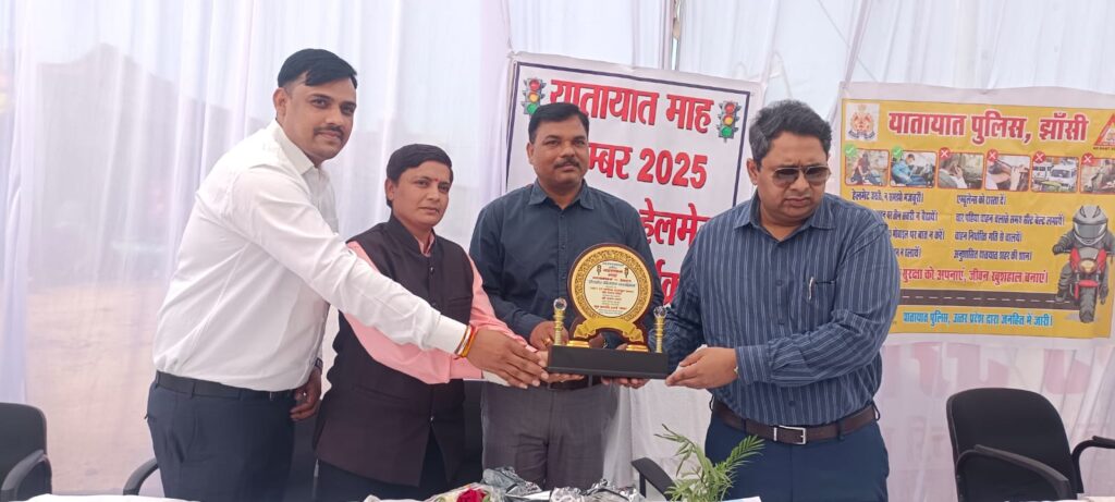 झाँसी। यातायात मlह नवंबर 2025 के क्रम में आज झांसी स्थित रक्सा टोल प्लाजा पर जिलाधिकारी मृदुल चौधरी के मुख्य आतिथ्य में उनके कर कमलों द्वारा ग्राम रक्सा के महिला पुरुष कामगारों, छात्र-छात्राओं, ग्रामीण जनों व पत्रकार बंधुओं को 120 हेलमेटों का वितरण किया गया। कार्यक्रम की अध्यक्षता प्रोजेक्ट हेड रंजय सिंह ने की, विशिष्ट अतिथि के रूप में एडीएम वित्त एवं राजस्व वरुण पांडे, एआरटीओ हेमचंद्र गौतम, टी आई उमाकांत ओझा, थानाध्यक्ष रक्सा रूपेश कुमार उपस्थित रहे।