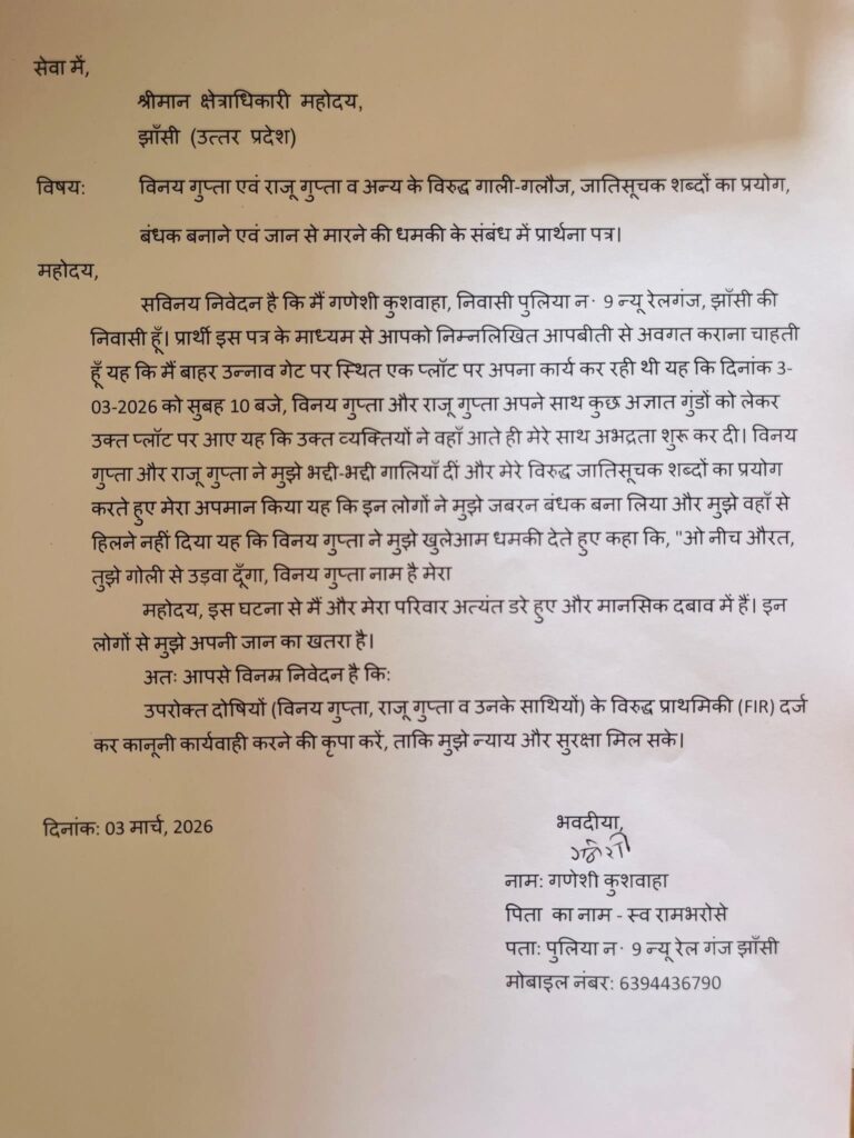 झाँसी। शहर में दबंगई और गुंडागर्दी का एक गंभीर मामला सामने आया है, जिसमें एक महिला ने कुछ लोगों पर अभद्रता, गाली-गलौज और जातिसूचक शब्दों का प्रयोग कर अपमानित करने के साथ-साथ जान से मारने की धमकी देने का आरोप लगाया है। पीड़िता ने इस पूरे प्रकरण की लिखित शिकायत क्षेत्राधिकारी झाँसी को सौंपते हुए दोषियों के विरुद्ध कड़ी कार्रवाई की मांग की है।