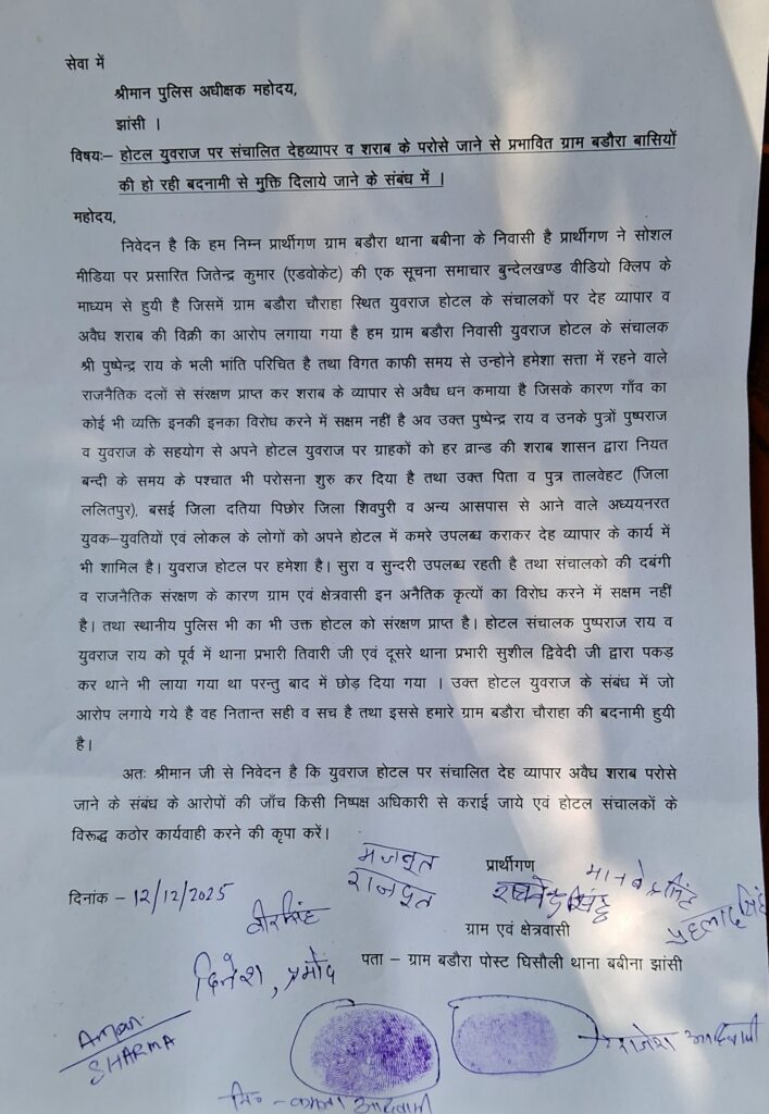 झाँसी। थाना बबीना क्षेत्र के ग्राम बड़ोरा के निवासियों ने स्थानीय होटल पर लगाए जा रहे देह व्यापार और अवैध शराब परोसे जाने के आरोपों को लेकर गंभीर चिंता व्यक्त की है। इस संबंध में बड़ी संख्या में ग्रामीणों ने 12 दिसंबर 2025 को वरिष्ठ पुलिस अधीक्षक झांसी को एक विस्तृत प्रार्थना-पत्र सौंपा, जिसमें सोशल मीडिया पर वायरल वीडियो में किए गए आरोपों की निष्पक्ष जांच की माँग की गई है।