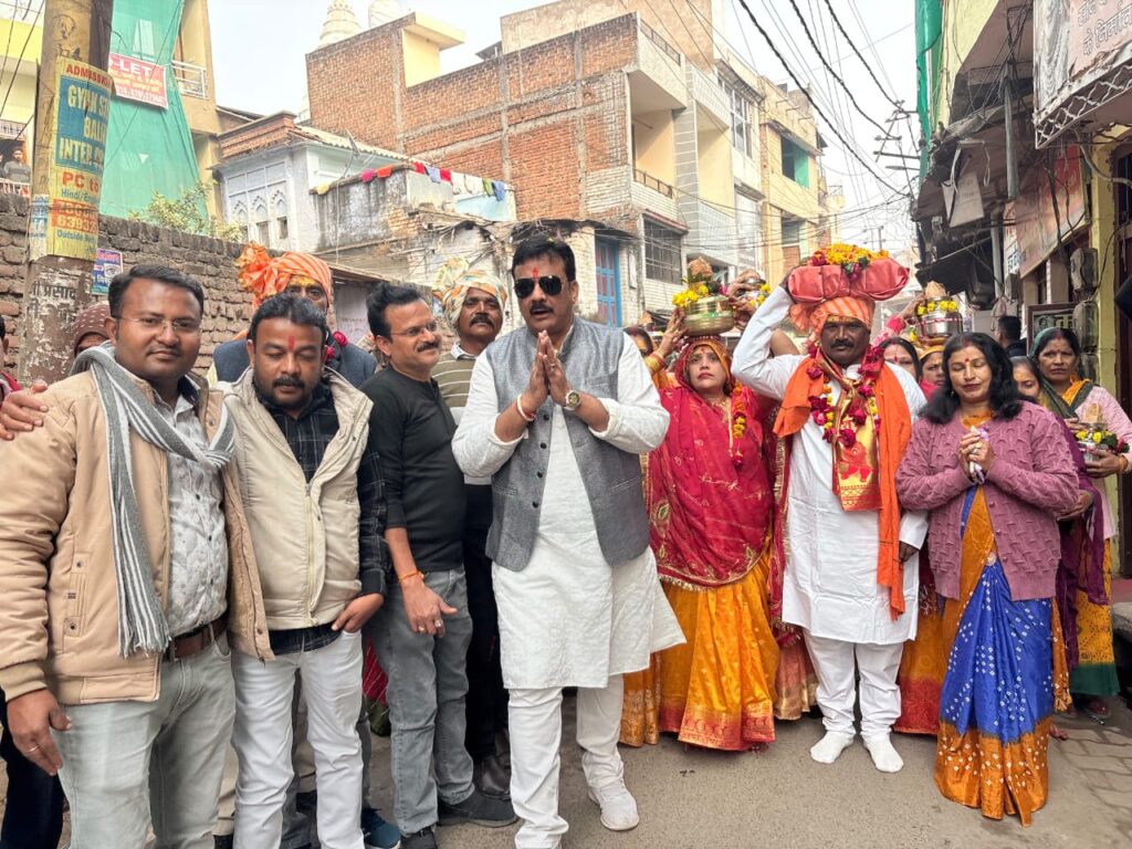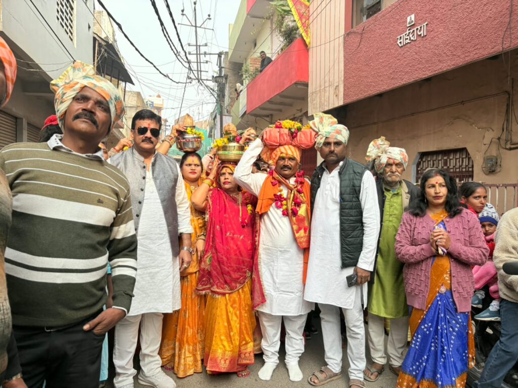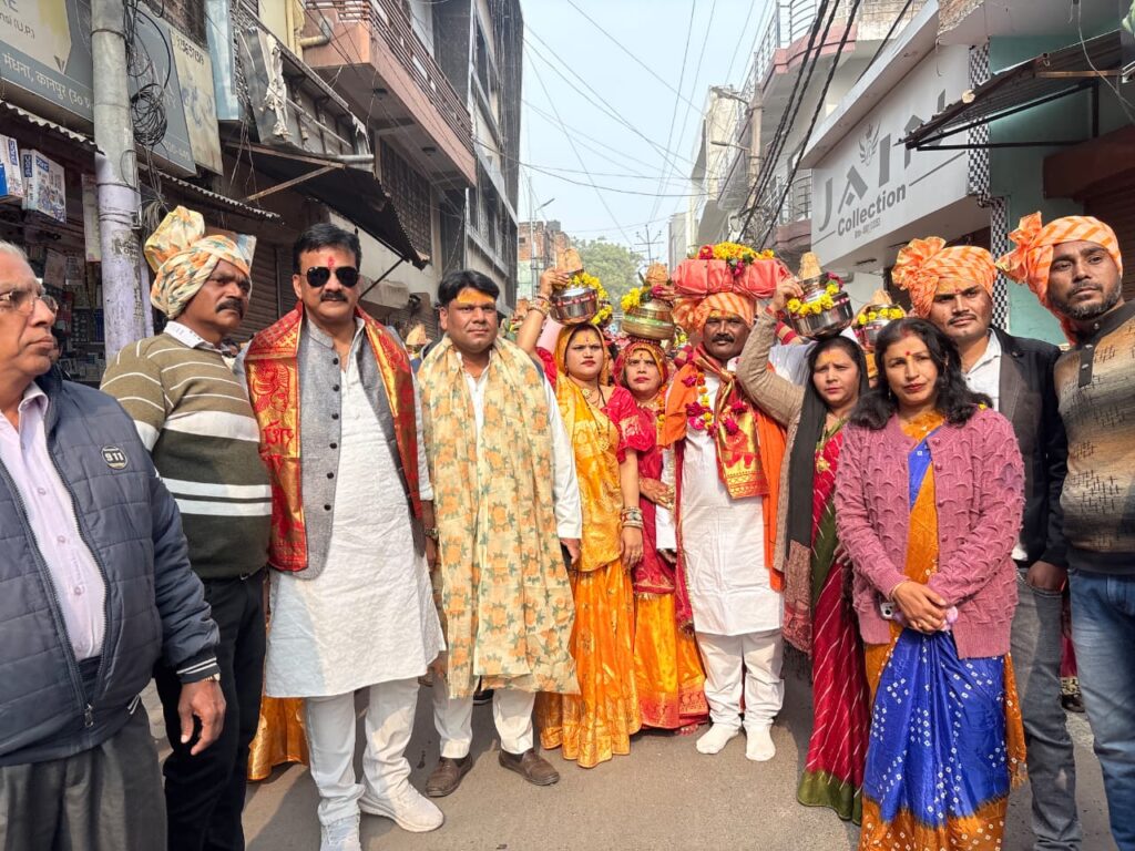 झाँसी। शिव मंगलम विवाह घर, बड़ागांव गेट के बाहर आयोजित श्री शिव महापुराण कथा का शुभारंभ प्रथम दिवस पर श्रद्धा और भक्ति के वातावरण में हुआ। कथा के शुभारंभ से पूर्व भव्य एवं दिव्य कलश यात्रा निकाली गई, जो कथा स्थल से पंचकुइयन माता मंदिर तक पहुंची। ढोल-नगाड़ों, भक्ति गीतों और जयकारों के साथ निकली कलश यात्रा में बड़ी संख्या में श्रद्धालु शामिल हुए, जिससे पूरा क्षेत्र शिवमय हो गया।